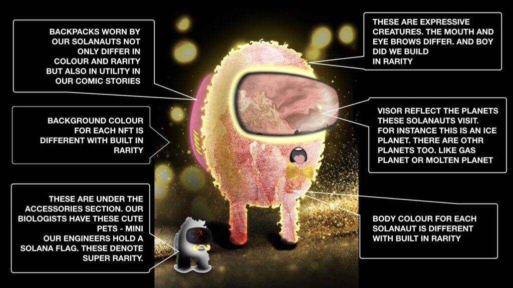 Generative Animated Short Films NFTs. Definitely the first of its kind.These are the adventures that these Solanauts are in for when they visit these planets. They could be engineering problems to less than friendly creature.